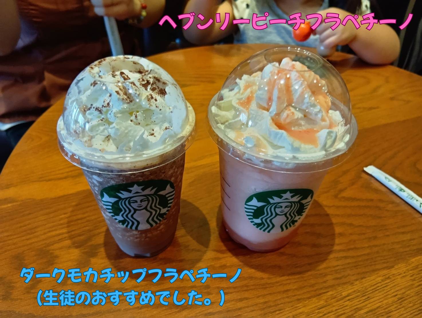 スタバでは生徒のおすすめの『ダークモカチップフラペチーノ』と、妻と子供で『ピーチフラペチーノ』を頼みました。店員さんにクーポンもらえる裏技も教えてもらって、大分お安く頼むことができました。