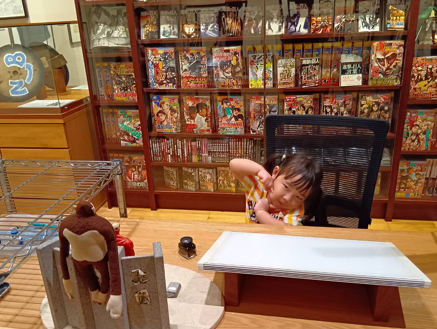 日田と言えば、進撃の巨人の諫山創先生の出身地としても有名です。進撃の巨人ミュージアムに最後に行きました。娘は巨人を怖がっていました。息子は何もわかっていませんでした…。諌山先生の机にも娘が座らせてもらって、とても楽しめる場所でした。