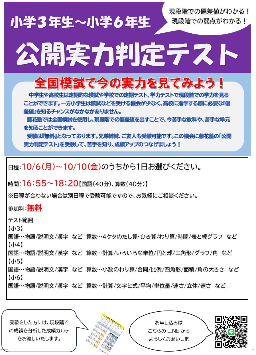 【10/6(月)~10/10(金)】公開実力判定テスト開催(小3~小6対象)