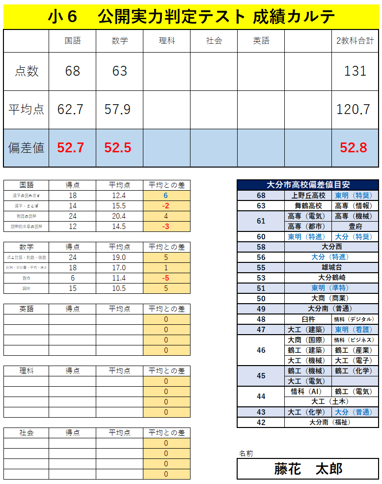 テスト終了後、結果を細かく分析した成績カルテをお渡しいたします。カルテは成績についてのご説明の際にお渡し、また郵送をお選びいただけます。お申し込みの際にお伝えください。