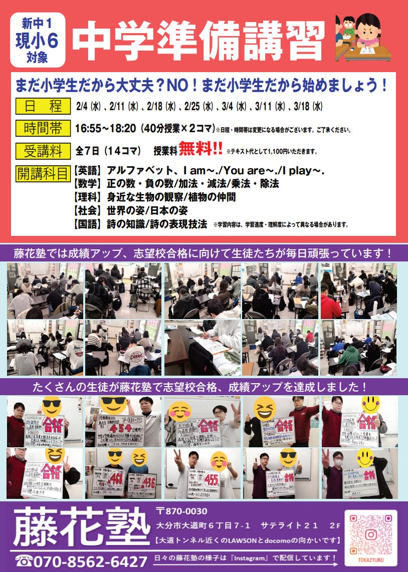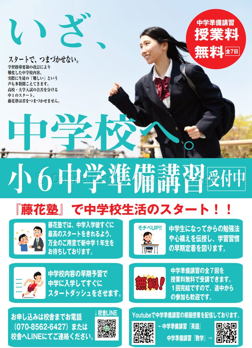 中学準備講習で、新しく藤花塾で一緒に勉強を頑張る生徒に出会えるのを楽しみにしております!