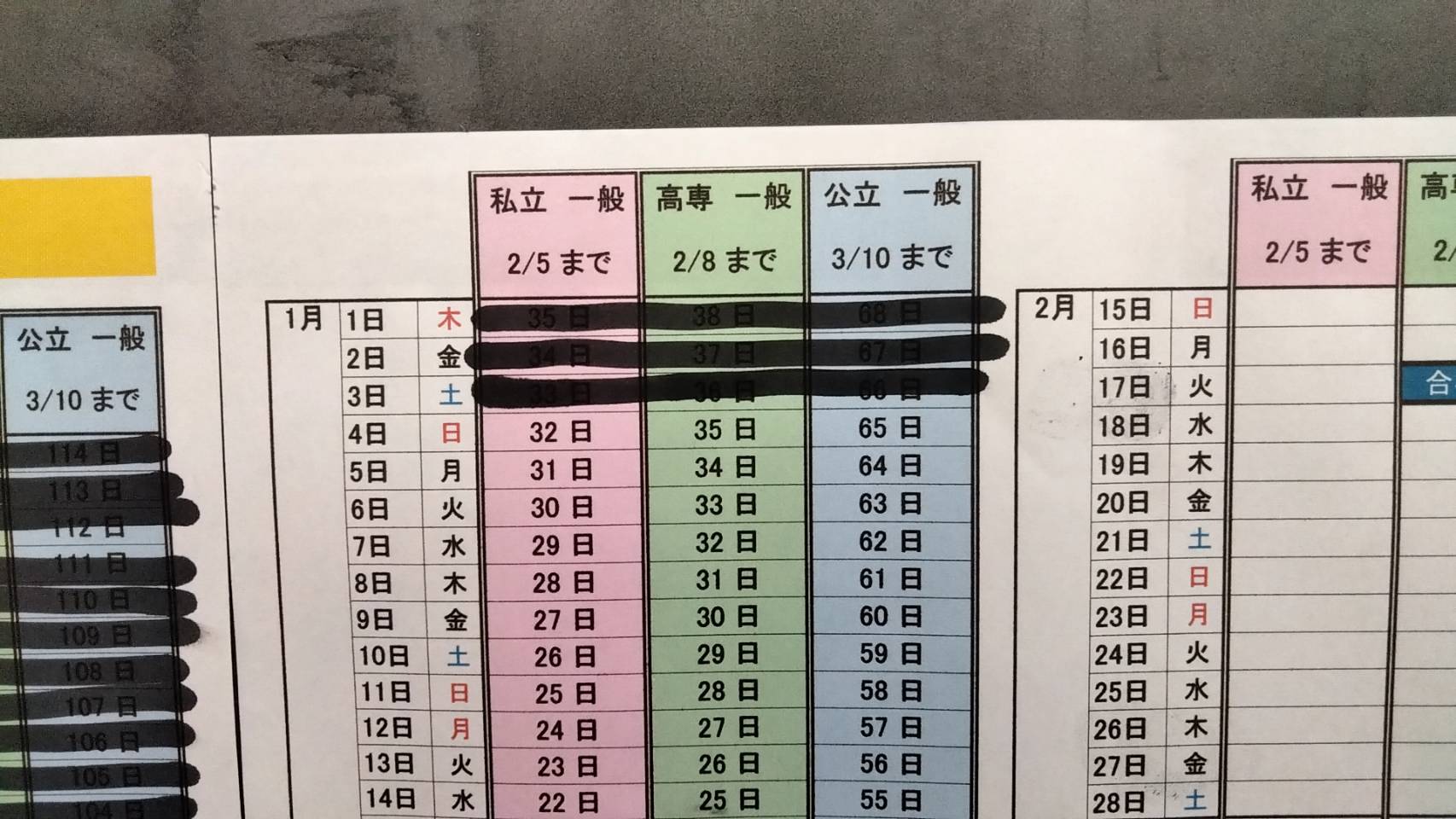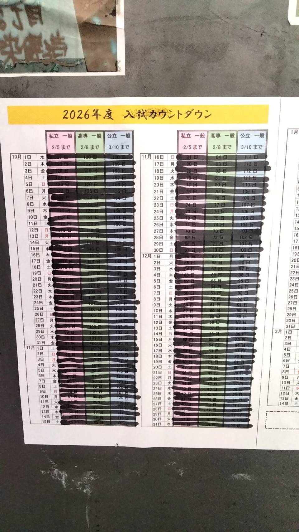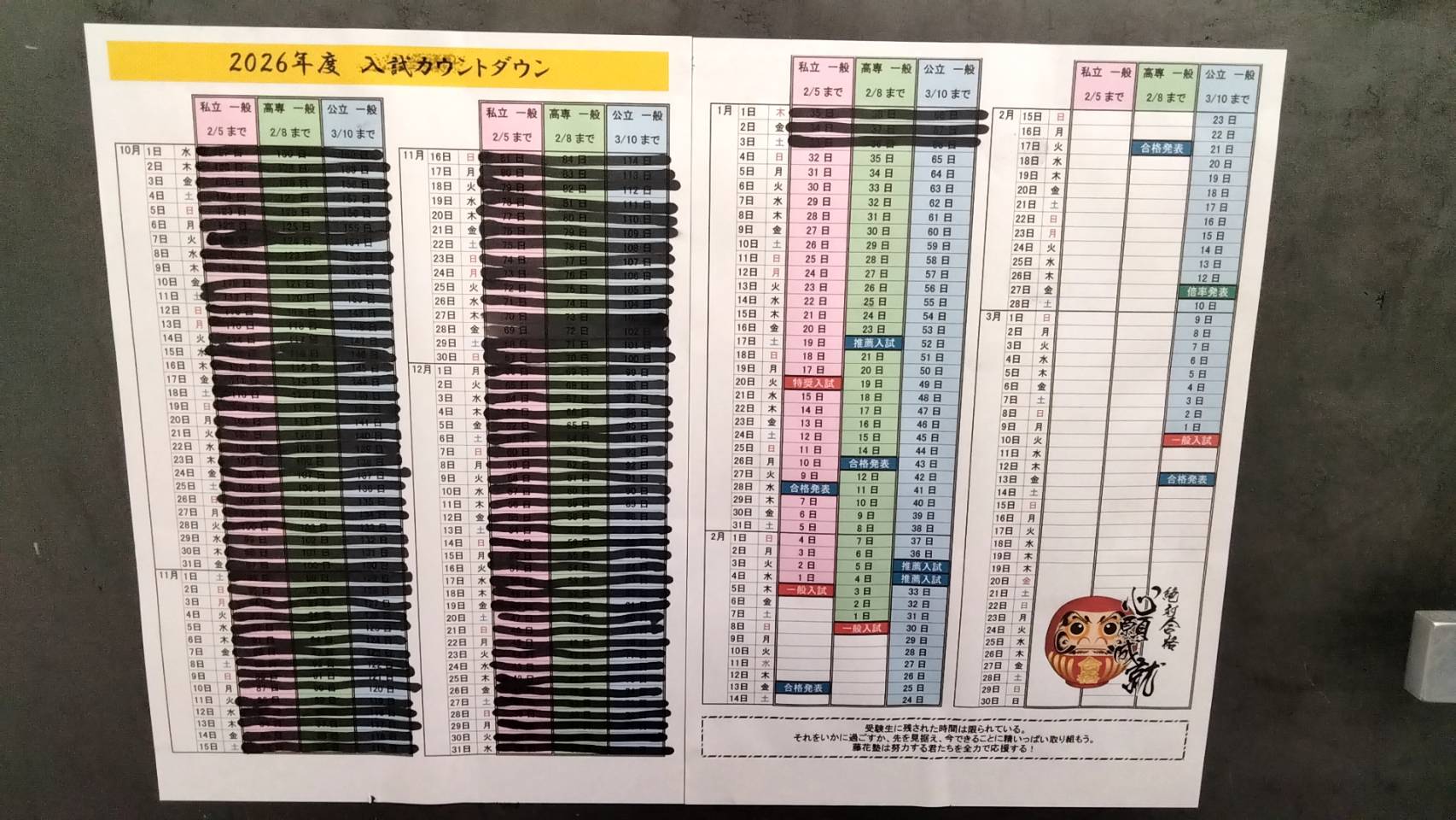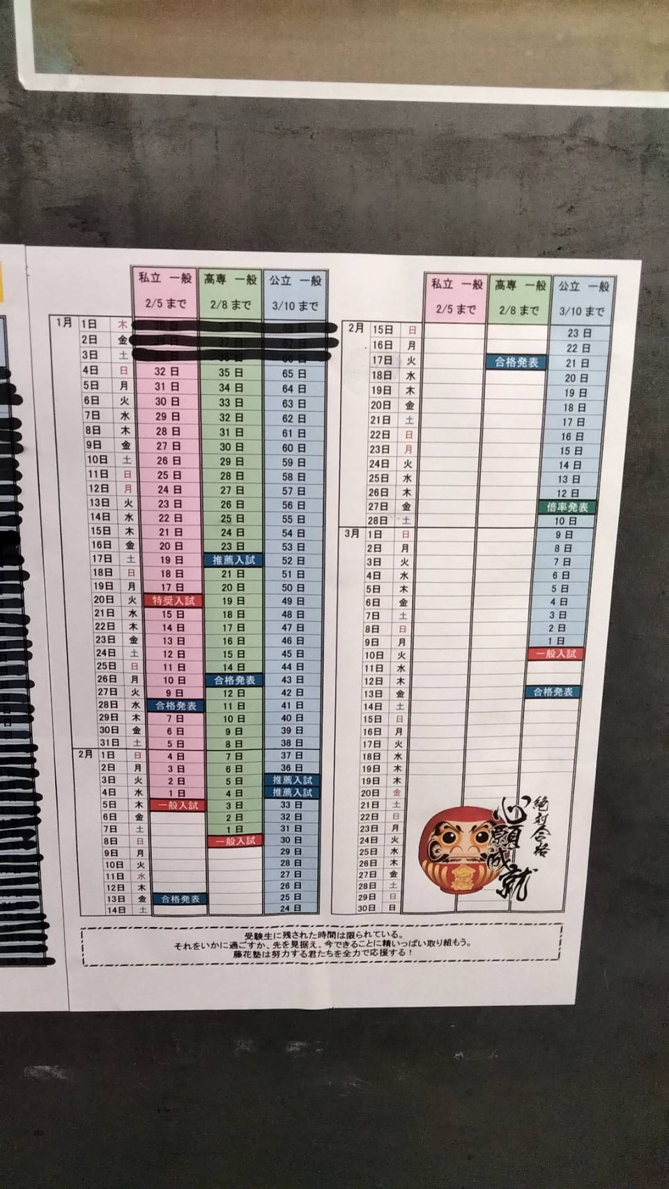 藤花塾では毎年10月から県立高校入試カウントダウンを掲示しています。年が明け、入試カウントダウンの左側が全て終わりました。