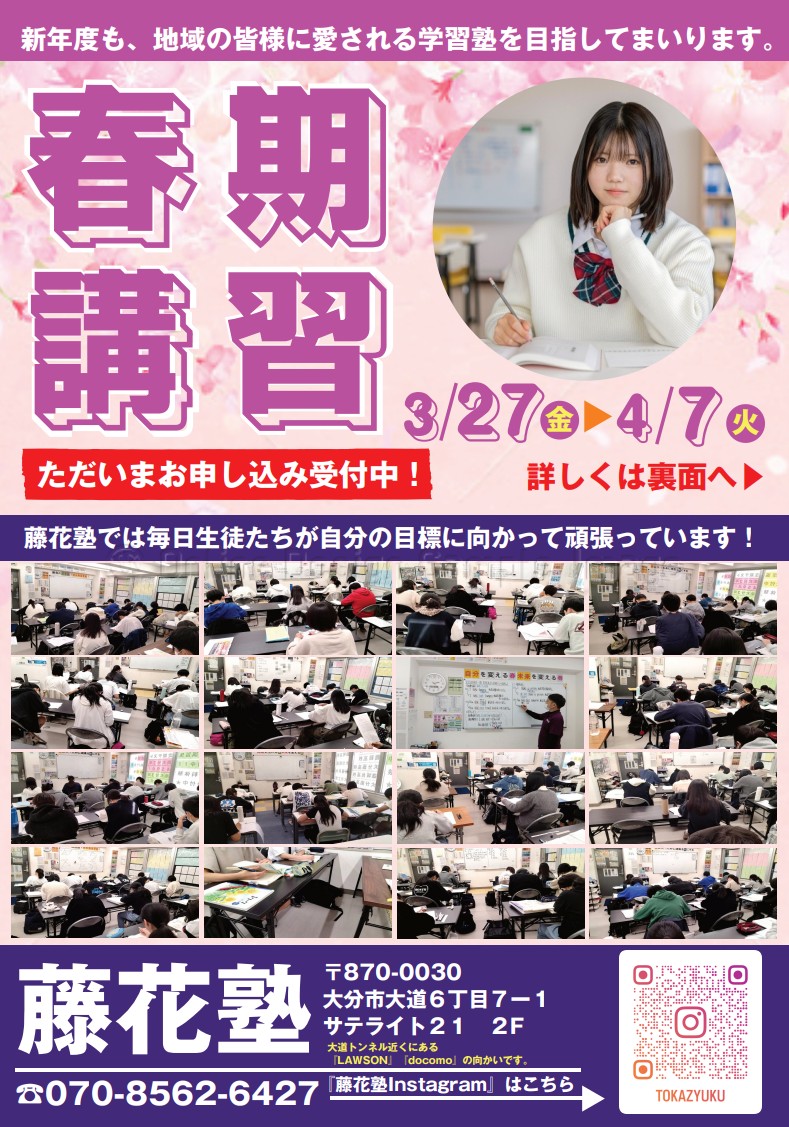 藤花塾では、新学年での成績アップ、志望校合格に向けて、春休み期間に『春期講習』を行い、新学年で頑張りたい生徒を応援していきます。