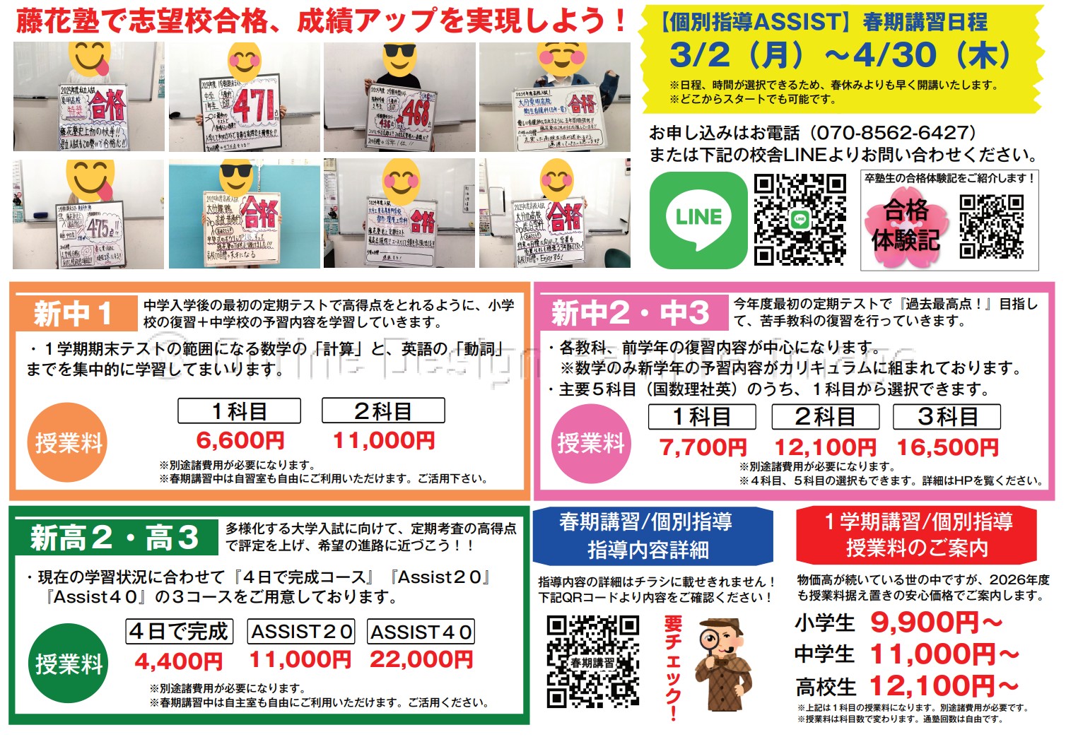 藤花塾の【じりつ型個別指導Assist】では、3/2(月)より春期講習がスタートします。個別指導の強みを生かして、一人一人の生徒の苦手克服、実力アップをお手伝いしてまいります。