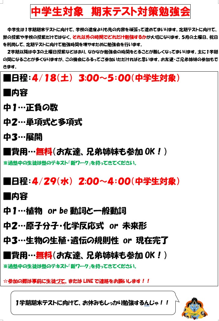 中学生対象 期末テスト対策勉強会!(参加無料!塾生以外も参加OK!))